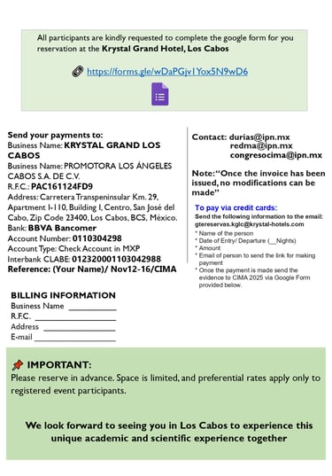 Special discounts will be applied for event participants (indicate your participation in the registration form) in Los Cabos, Baja California Sur, Mexico.